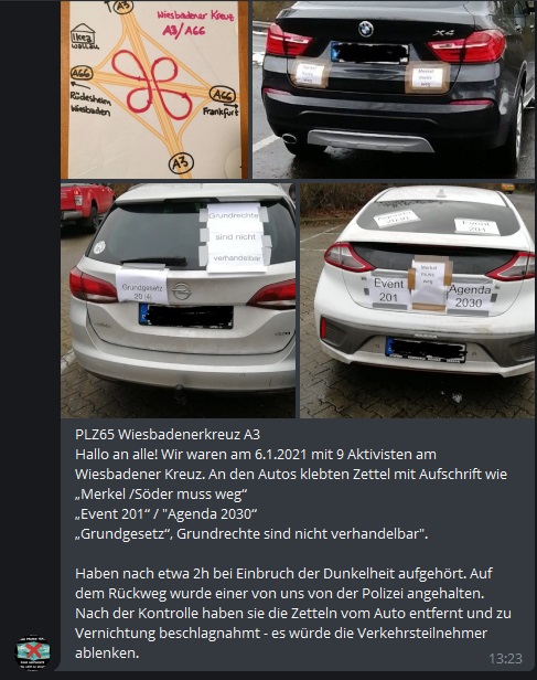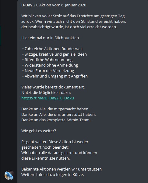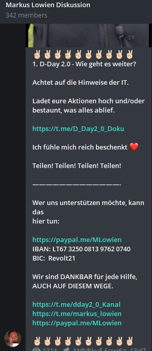 Wie man an den Bildern gut erkennen kann, gab es deutschlandweit vereinzelte Gruppen, die versuchten auf sich aufmerksam zu machen. Außerdem gab es ein paar Autofahrer, die es für „Widerstand“ hielten, sinnlos mit dem Auto den Verkehr zu behindern. Im Rahmen der Geschehnisse in den USA, sind die kleinen Aktionen hier in Deutschland medial untergegangen. Markus Lowien hat wohl selbst bemerkt, dass seine Gefolgschaft nicht sonderlich groß und aktiv ist. Deshalb hat er direkt im Anschluss eine Motivations- und Danksagungsnachricht geschrieben und ein Video gedreht, um die Gemüter zu beruhigen und direkt klarzustellen, dass das natürlich erst der Anfang war. Lowien lässt sich genau wie Ballweg und Co. von seinen Anhängern finanziell unterstützen. Seine Bankverbindung ist direkt im Anhang seiner Telegram-Nachrichten hinterlegt. Es war also abzusehen, dass Lowien den „D-Day 2.0“ als „Bewegung“ weiterführen wird. Eine zahlende Gefolgschaft muss eben bei Laune gehalten werden. Ich habe das Gefühl, dass es zur Masche geworden ist, den politischen Unmut vieler Menschen auszunutzen, um sich selbst finanziell zu bereichern.