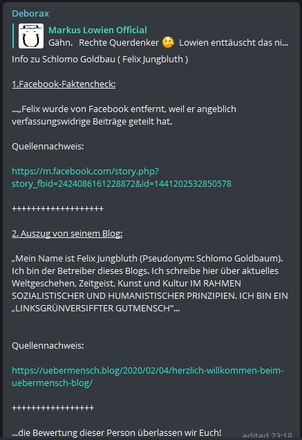 Diese Reaktionen zeigen deutlich, dass ich einen Nerv getroffen habe. Ich hoffe wirklich, dass sich Lowien wie ein erwachsener Mensch verhält, Verantwortung übernimmt und sich einfach für den Mist entschuldigt. Zusätzlich sollte er dann noch seine Telegram-Gruppen und Chats schließen, um einen Riegel vor die Hetze und den Hass zu schieben.
