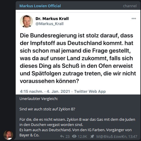 Es ist unglaublich aber wahr. Der Querdenker und Begründer der Aktion „D-Day 2.0“, Markus Lowien, hat in seiner Telegram-Gruppe, die Corona-Impfungen mit dem tödlichen Gift Zyklon-B verglichen, mit dem Millionen Juden während der Shoa, in den Gaskammern der Nazis, ermordet worden sind.