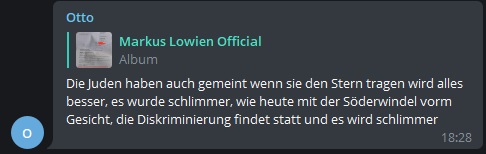 Ein Anhänger von Lowien behauptete in der gleichen Gruppe, dass die Juden wohl während der NS-Zeit gedacht hätten, es würde ihnen helfen den gelben Stern zu tragen. Genauso soll das wohl auch heute mit der „Söderwindel“ (MNS) sein. Die Diskriminierung soll wohl immer schlimmer werden.