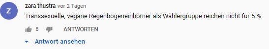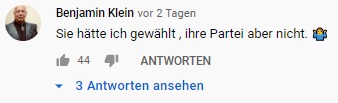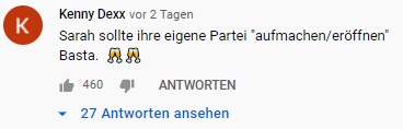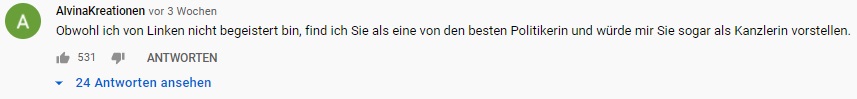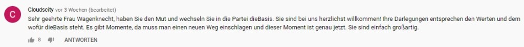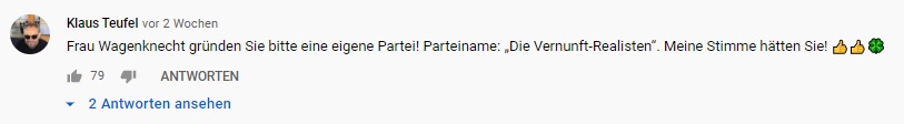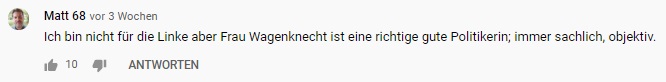 Auf Youtube betreibt Wagenknecht einen sehr großen und erfolgreichen Kanal mit über 280.000 Abonnenten. Auf diesem Kanal erklärt sie regelmäßig ihre eigene Weltanschauung und kritisiert die aktuelle Politik. Dabei vertritt sie häufig völlig andere Standpunkte, als die Linke im Wahlprogramm beschlossen hat. Sie wird von sehr vielen Leuten geschätzt, die mit der Linken und linker Politik allgemein nichts zu tun haben. Viele wünschen sich ihren Austritt aus der Partei und finden es schade, dass sie in der Linken ihre Zeit verschwendet. Die Mehrheit ihrer Fans wählt nicht links. Das liegt daran, dass Frau Wagenknecht keine linken Positionen vertritt und in der rechtskonservativen Ecke immer beliebter wird. Die AfD hat mehrfach die Gemeinsamkeiten zwischen ihnen und Wagenknecht betont. Ihre Anhängerschaft folgt ihr und ihren Thesen, aber nicht der Politik der Linken. Hier habe ich mal eine kleine Auswahl an Kommentaren zusammengestellt, die man unter ihren Youtubevideos findet, die deutlich machen, wie viele Fans von Wagenknecht denken.